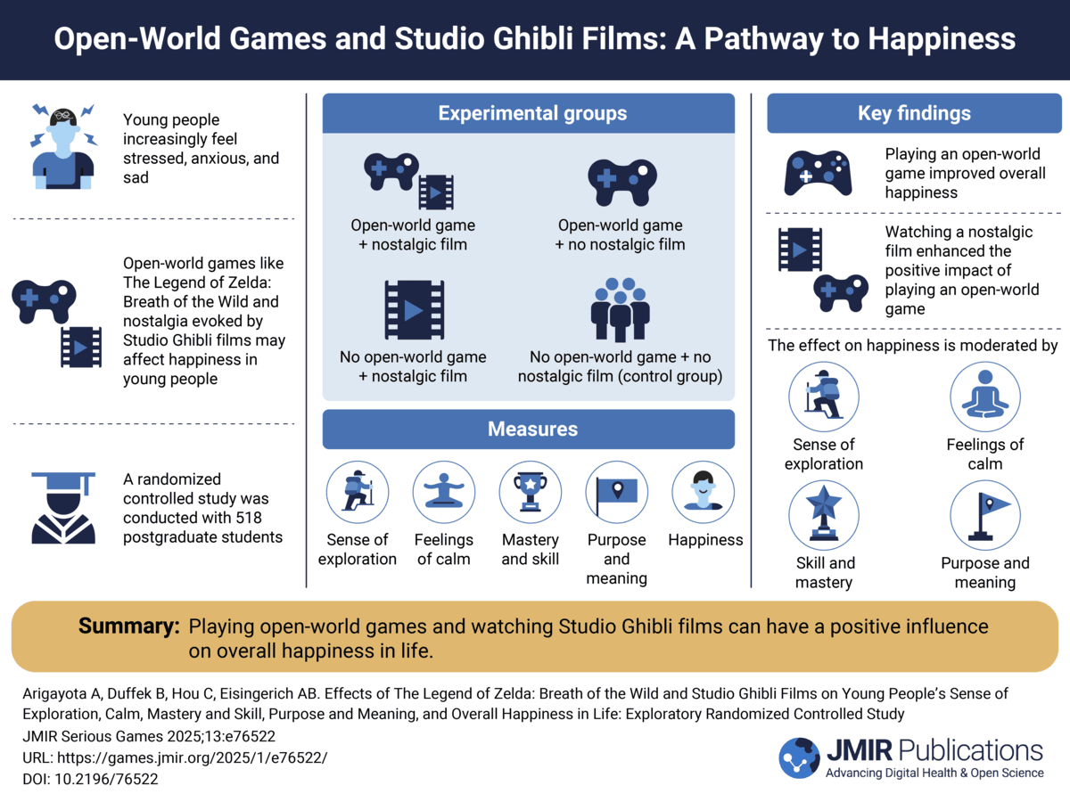 Source: Arigayota A, Duffek B, Hou C, Eisingerich A Effects of The Legend of Zelda: Breath of the Wild and Studio Ghibli Films on Young People’s Sense of Exploration, Calm, Mastery and Skill, Purpose and Meaning, and Overall Happiness in Life: Exploratory Randomized Controlled Study JMIR Serious Games 2025;13:e76522 DOI: 10.2196/76522