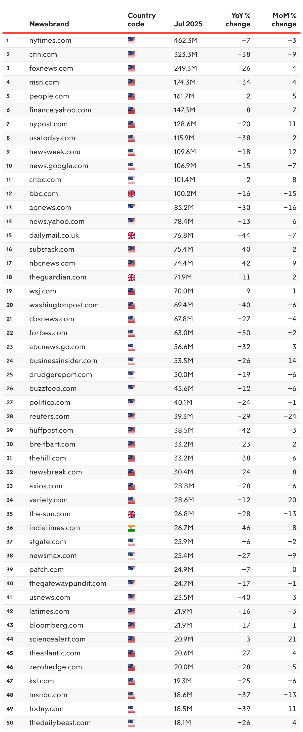 arrow-up1134arrow-down1imageTop 50 news websites in the US in July: BBC drops five places as paywall introduced; Most report traffic declines.datawrapper.dwcdn.netPro@programming.dev to Technology@lemmy.worldEnglish · 3 months agomessage-square30fedilinkfile-text