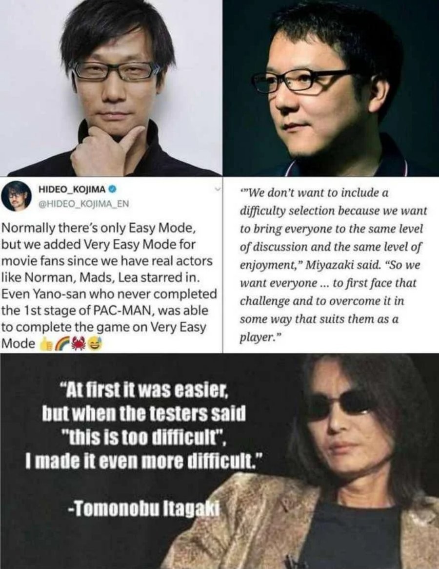 I think Kojima gets it. For a lot of players, esp. on the more cinematic games, the story is the main driver and the action is how it progresses. The games I’ve played that were ordeals are often the ones I’ve given up on. It’s the ones you can start on story mode with, enjoy the narrative and then re-play at the harder levels that I’ve stuck with.