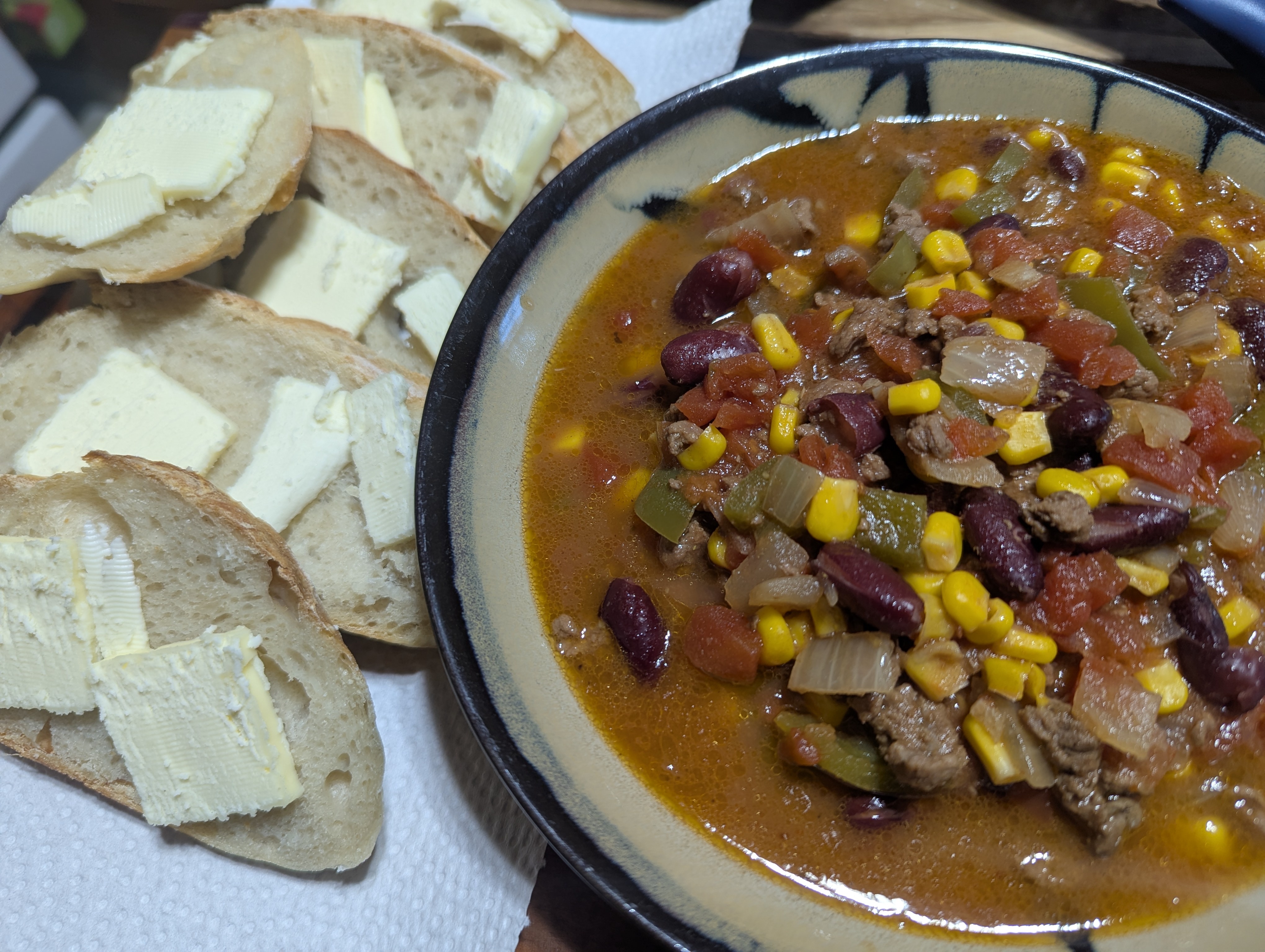 Bring to a boil, reduce to simmer for as long as your nap lasts. Add a drained can of each corn and kidney beans. Add salt and adjust seasoning as needed. Simmer for another 15 minutes.