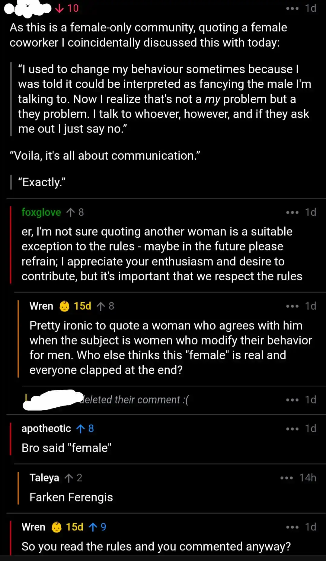 Absolutely! I encourage support spaces for everyone. I’m calling out the irony that this user is up and down this thread arguing against the women’s community and spouting female priviledge ideology, while now complaining that men can’t have the same thing… or else people will complain and spout male priviledge ideology.