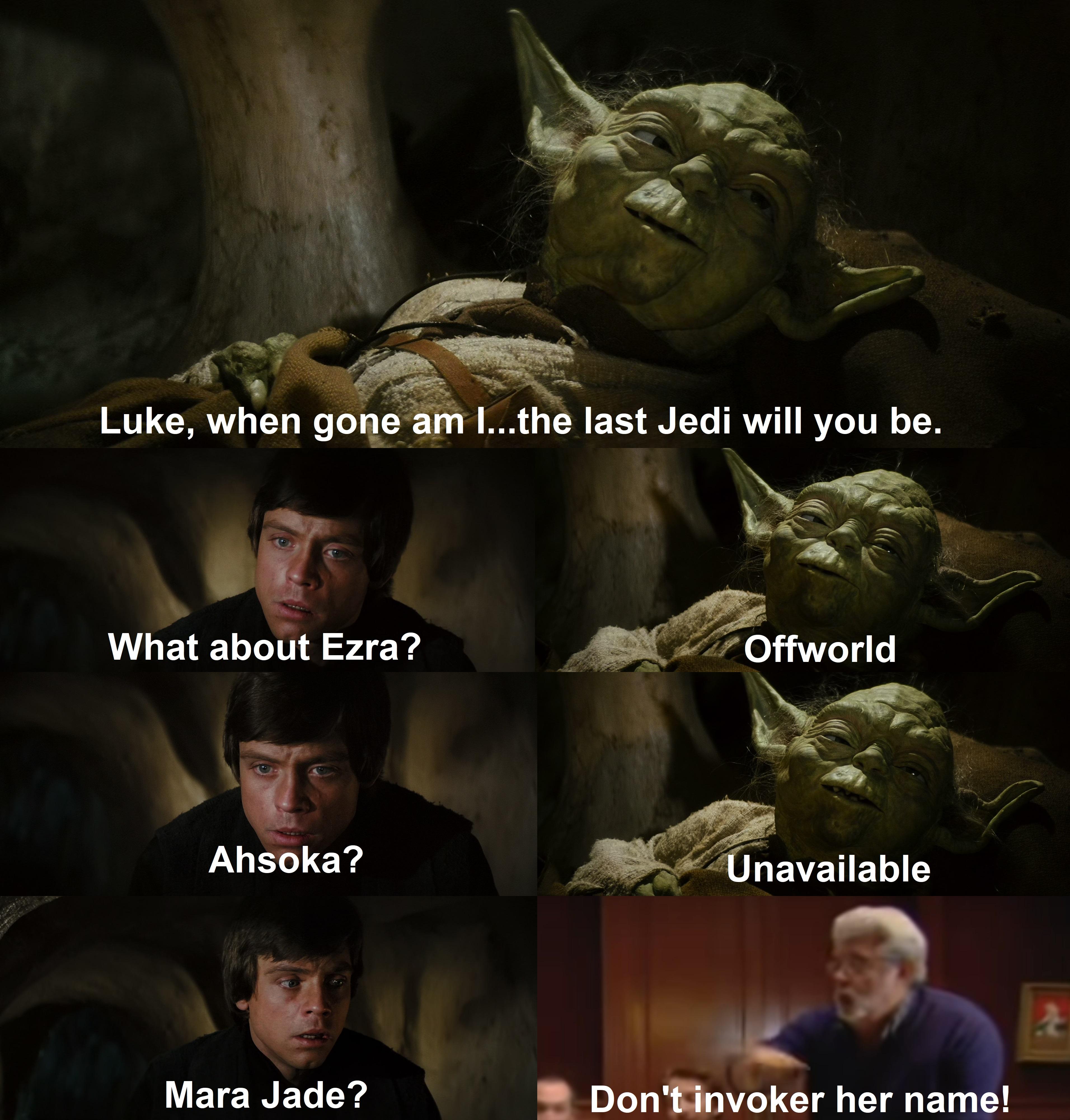 Rebels: Kanan is dead by now, and Ezra would be lost in deep space at this point. Yoda also wouldn’t know about either.