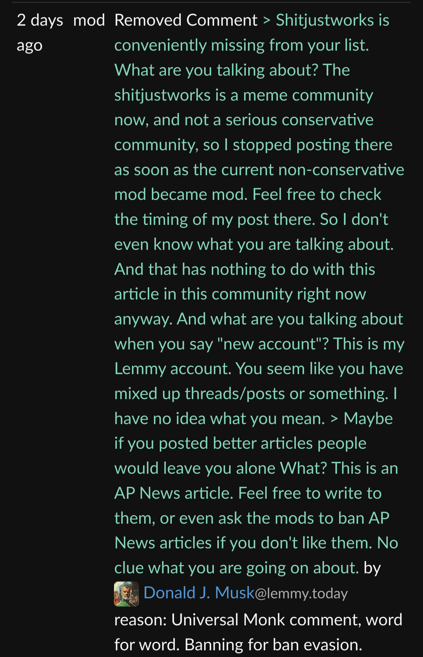 arrow-up1203arrow-down1imageNotorious right wing troll gets one of his many accounts banned for evasionlemmy.worldLookBehindYouNowAndThen@lemmy.world to [CLOSED] FediLore + Fedidrama@lemmy.ca · 7 months agomessage-square125fedilinkfile-text