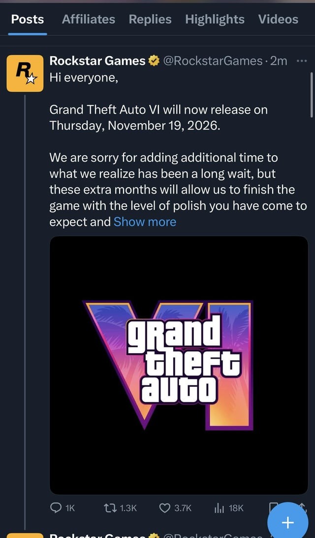 arrow-up127arrow-down1imageGTA 6 has been delayed AGAIN piefed.europe.pubcrunch@piefed.europe.pub to Gaming@lemmy.worldEnglish · 2 days agomessage-square10fedilink